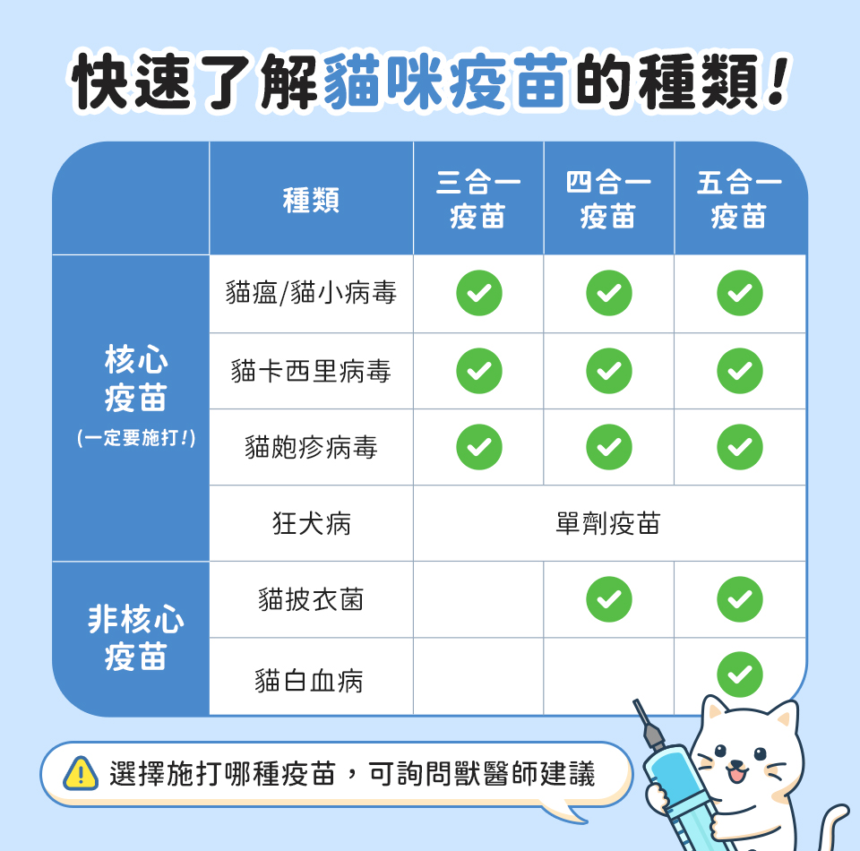 1. 核心疫苗:施打對象,不分年齡貓咪,皆建議施打。