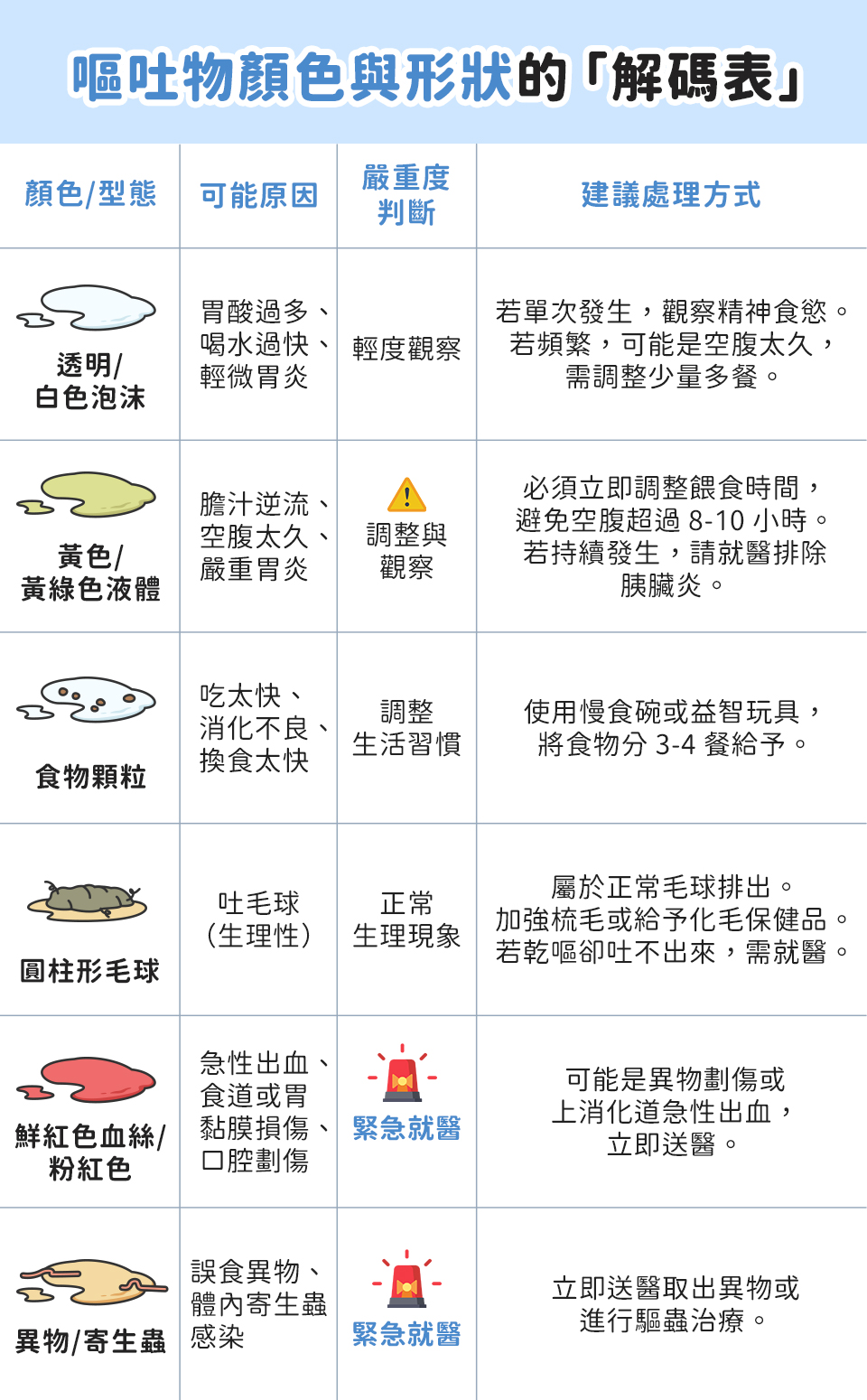 嘔吐物的外觀是判斷嚴重性的關鍵線索!請您下次務必先拍照,這對獸醫診斷至關重要。