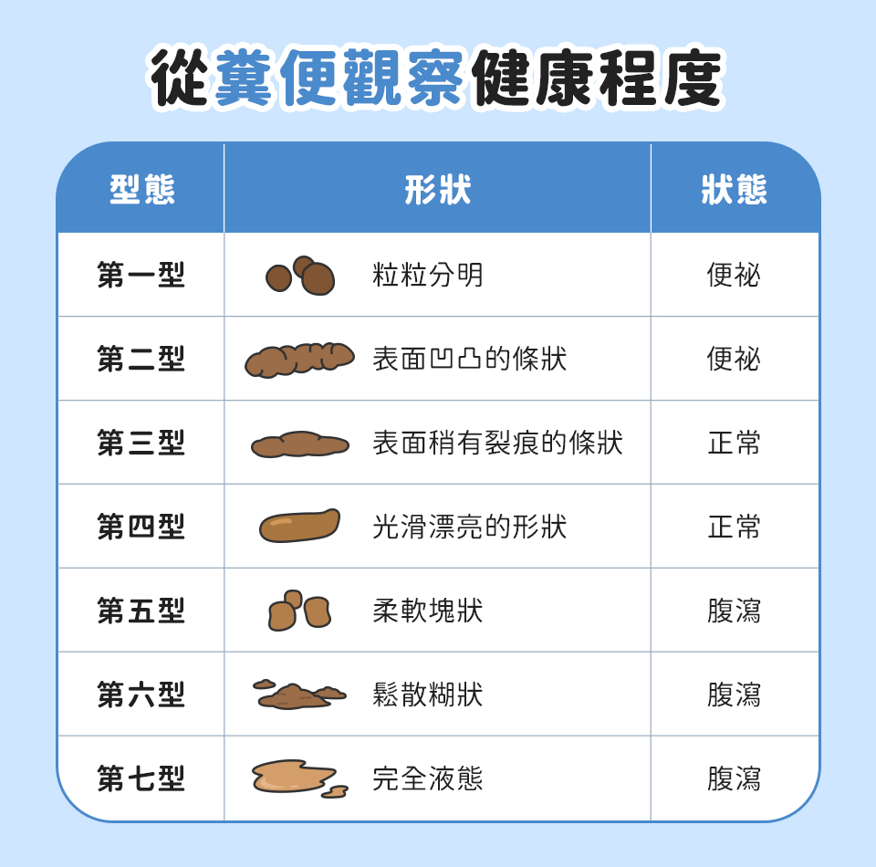 狗狗拉肚子原因多,毛主人可先「觀察糞便」做簡易檢查。健康便便應光滑、成形、易拾起;異常則乾硬或水便。醫學上用「布里斯托大便分類法」分成7類,毛主人可對照糞便型態,判斷是否需就醫或補充益生菌。