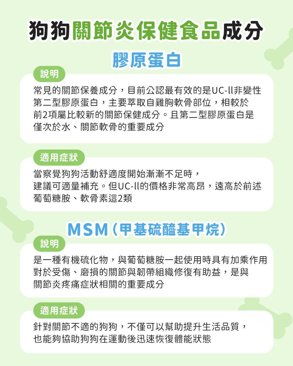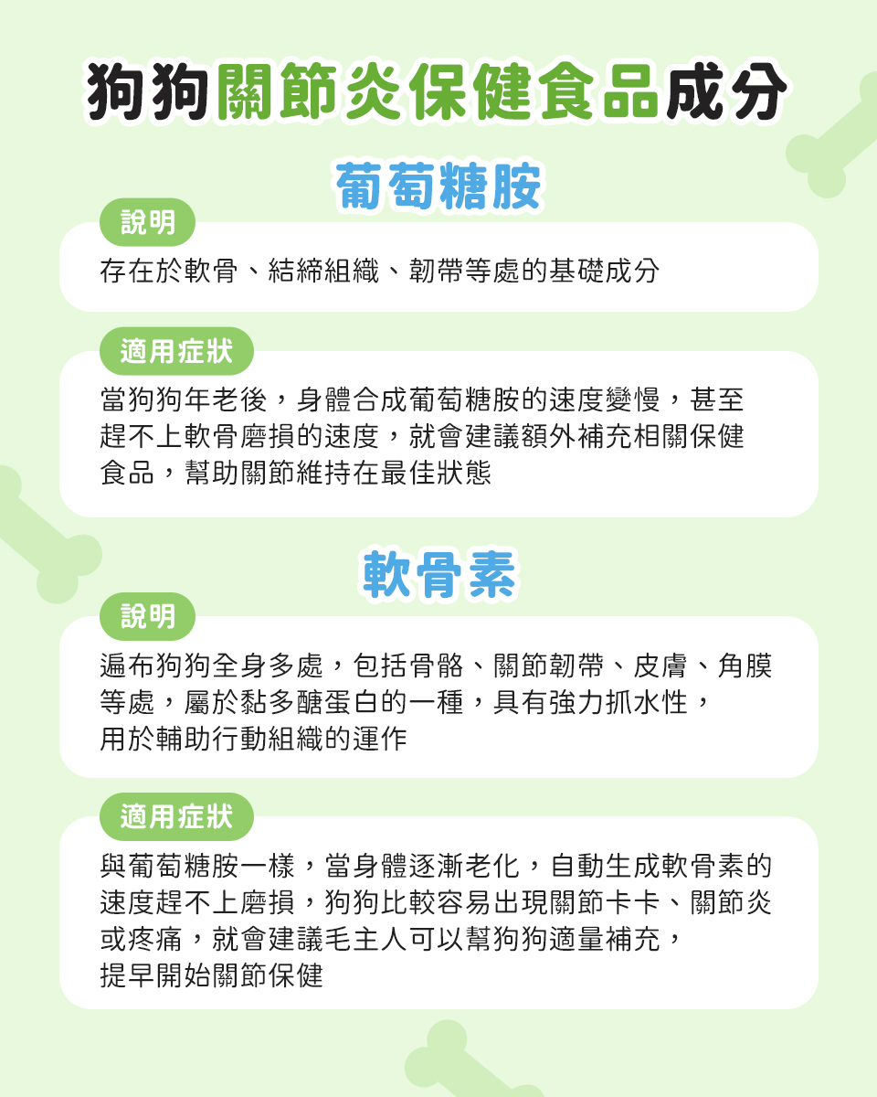 除了日常照護與飲食調整,補充關節保健食品也是常見方式。但市售產品種類繁多,成分、吃法與挑選方式常讓毛主人困惑。別擔心,以下將說明常見關節成分功效,幫助你依毛孩需求安心選擇。