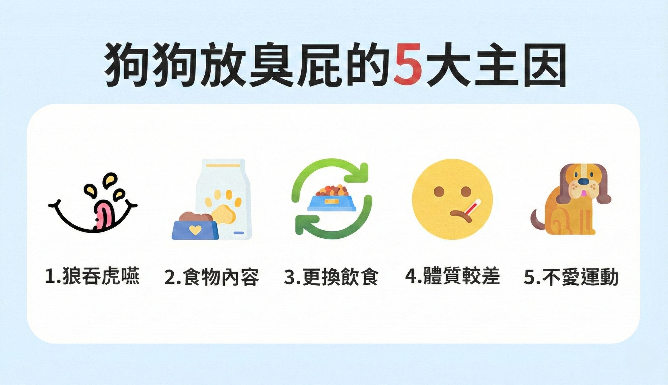 • 更換飲食過快:未給腸胃適應期,突然換飼料或飲食型態,易導致放屁或腹瀉。