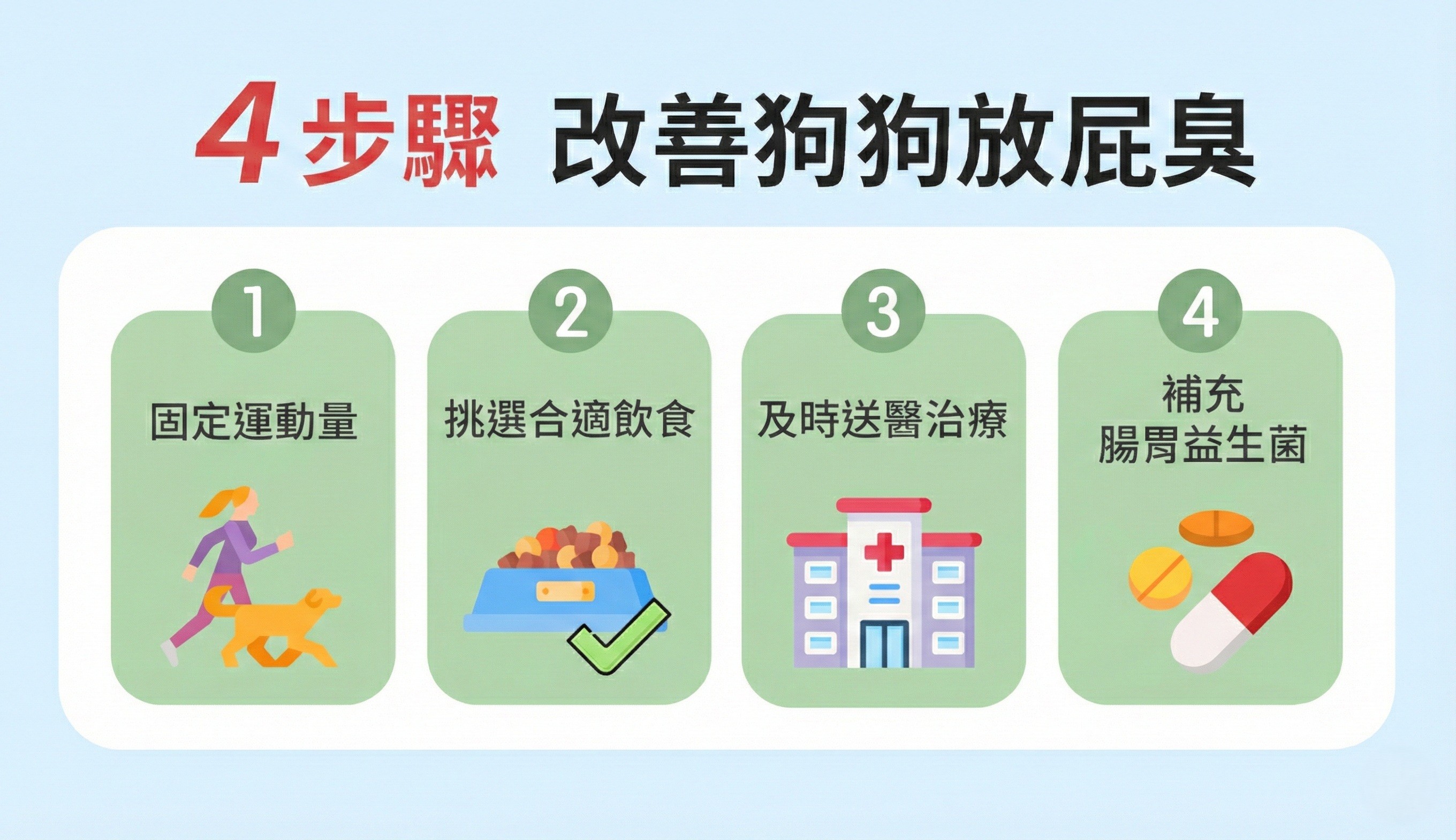 • STEP 2|挑選合適飲食:部分狗狗對特定食物敏感,輕則放屁變多,重則嘔吐、腹瀉。若發現吃某些食物後出現不適,應立即避免。選擇「狗狗愛吃、也適合吃」的飲食,是維持腸胃健康、降低臭屁的關鍵。