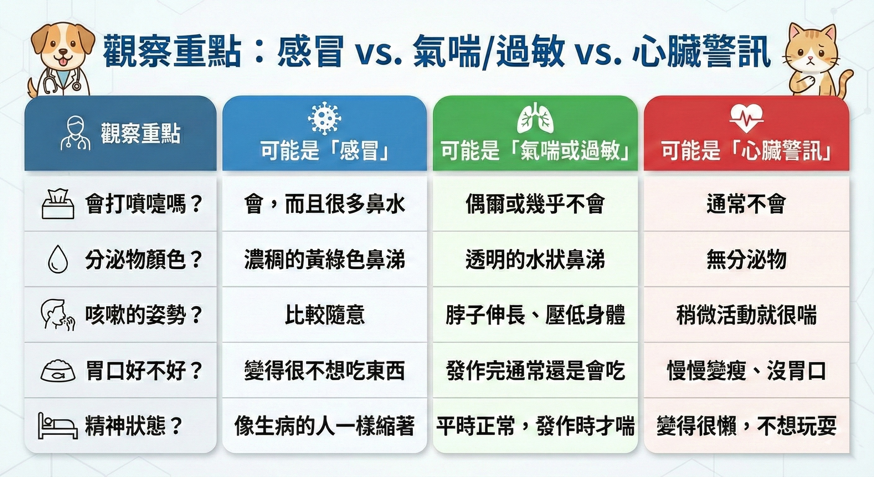 如果你的貓咪出現狀況,可以先用這張表對照看看,能幫助你在看診時更精準地跟獸醫描述病情: