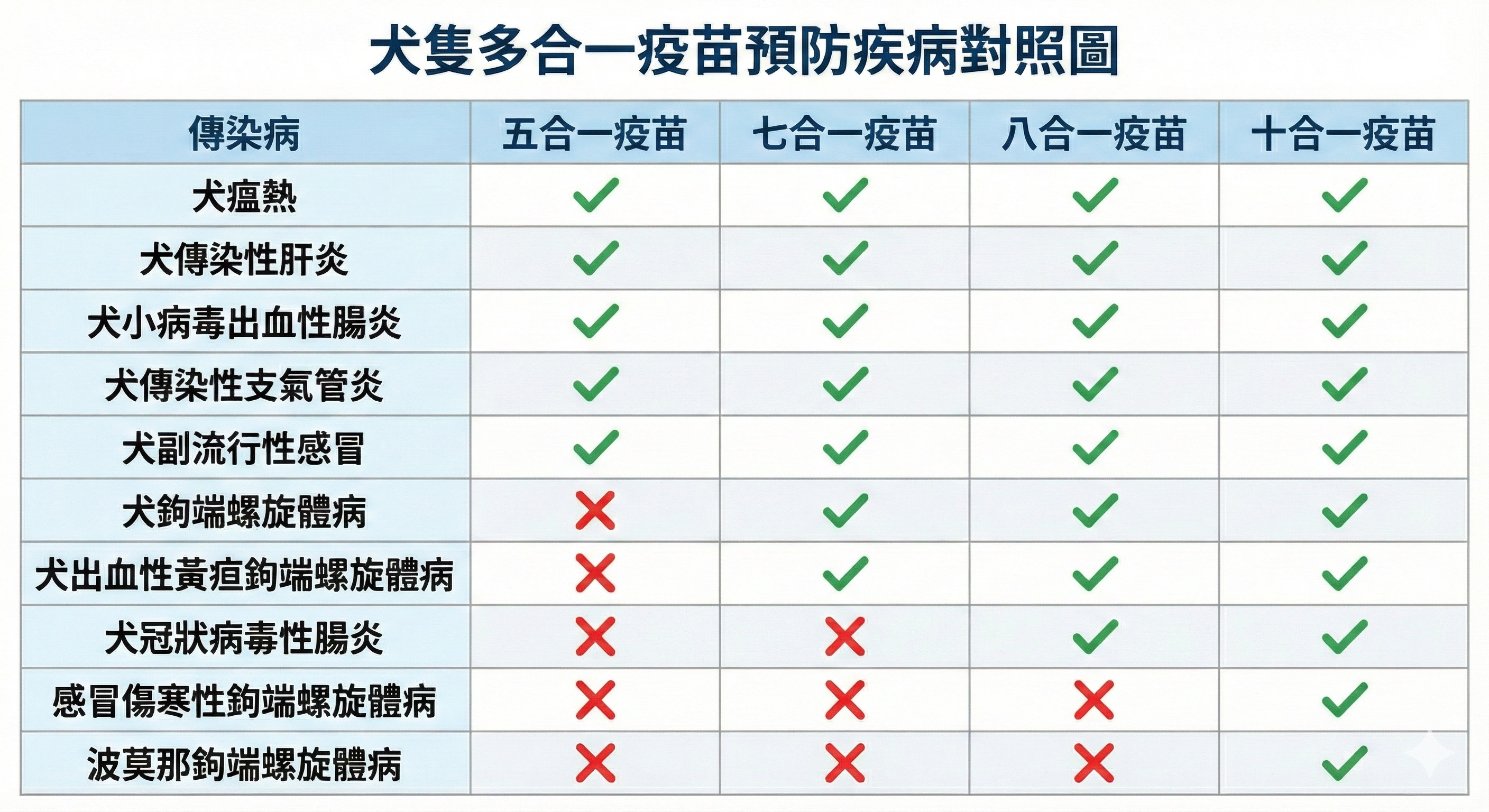 檢查進行前須先為狗狗建立完整資料,獸醫會先問診以了解狗狗的平時生活習慣,再藉由視診、觸診、聽診等方式,評估寵物基本的身體狀況。 血液檢查、X光、超音波也是健檢的必須環節,血檢報告可以檢測出肉眼看不出的異狀,包括狗狗的凝血功能、器官是否健全,體內有無寄生蟲等。 狗狗疫苗種類非常多,區分為「核心疫苗」與「非核心疫苗」兩大類 核心疫苗:為預防「犬瘟熱、犬小病毒、犬傳染性肝炎、狂犬病」這些具高傳染性、高致死率的重大傳染病的疫苗。 非核心疫苗:針對犬副流行感冒病毒、鉤端螺旋體、犬冠狀病毒、萊姆病等疾病的疫苗,在台灣屬非核心疫苗的範疇。
