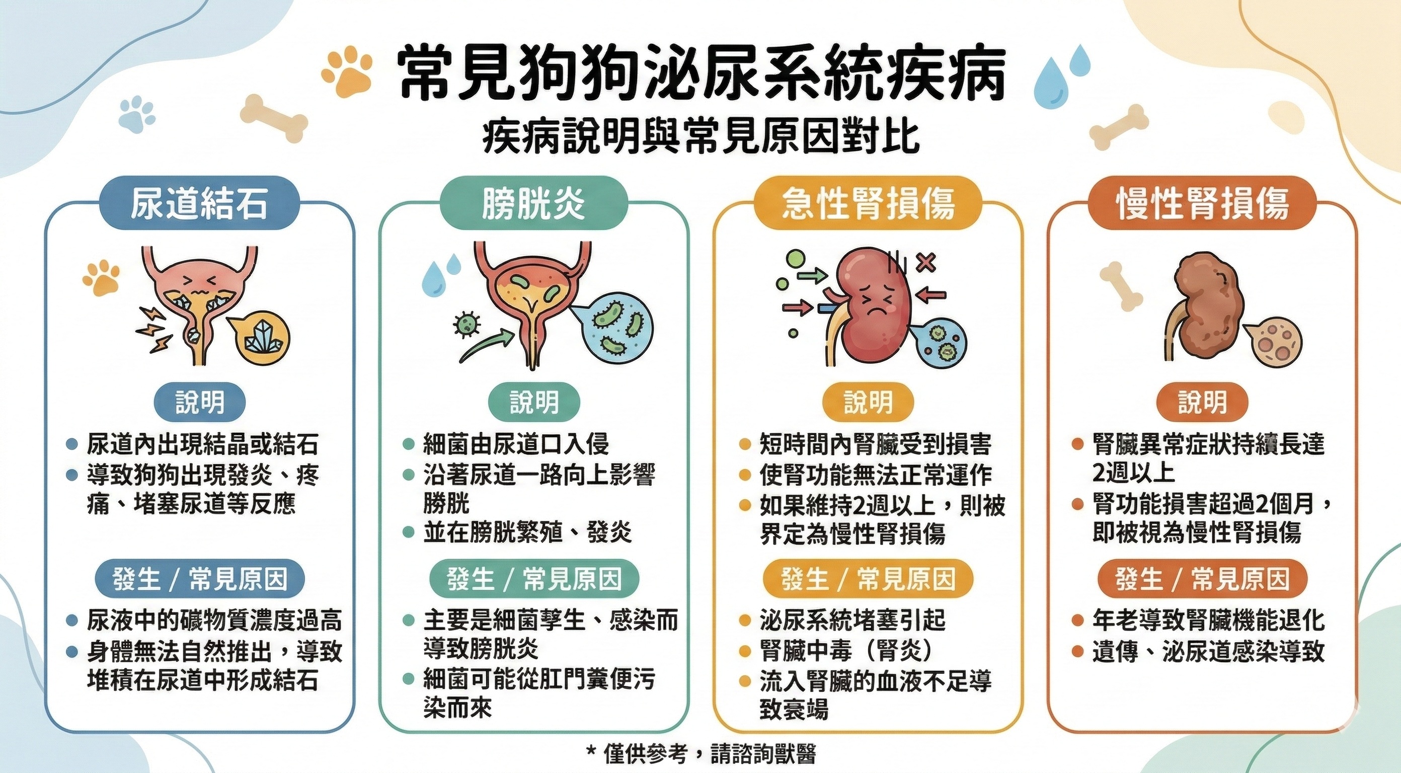 腎臟是體內代謝毒素、廢物,調節水分與電解質平衡的重要器官,同時身兼「製造尿液」的重責大任。當狗狗每天喝水量充足時,腎臟便能將體內毒素與尿液一同排出體外;但如果水分攝取不足,身體長期呈現微脫水的狀態,稀少的尿液量將不足以把體內廢物完整排空,長久下來可能會導致腎功能異常,甚至是慢性腎衰竭等情況。而憋尿可能造成/影響的疾病就如下: