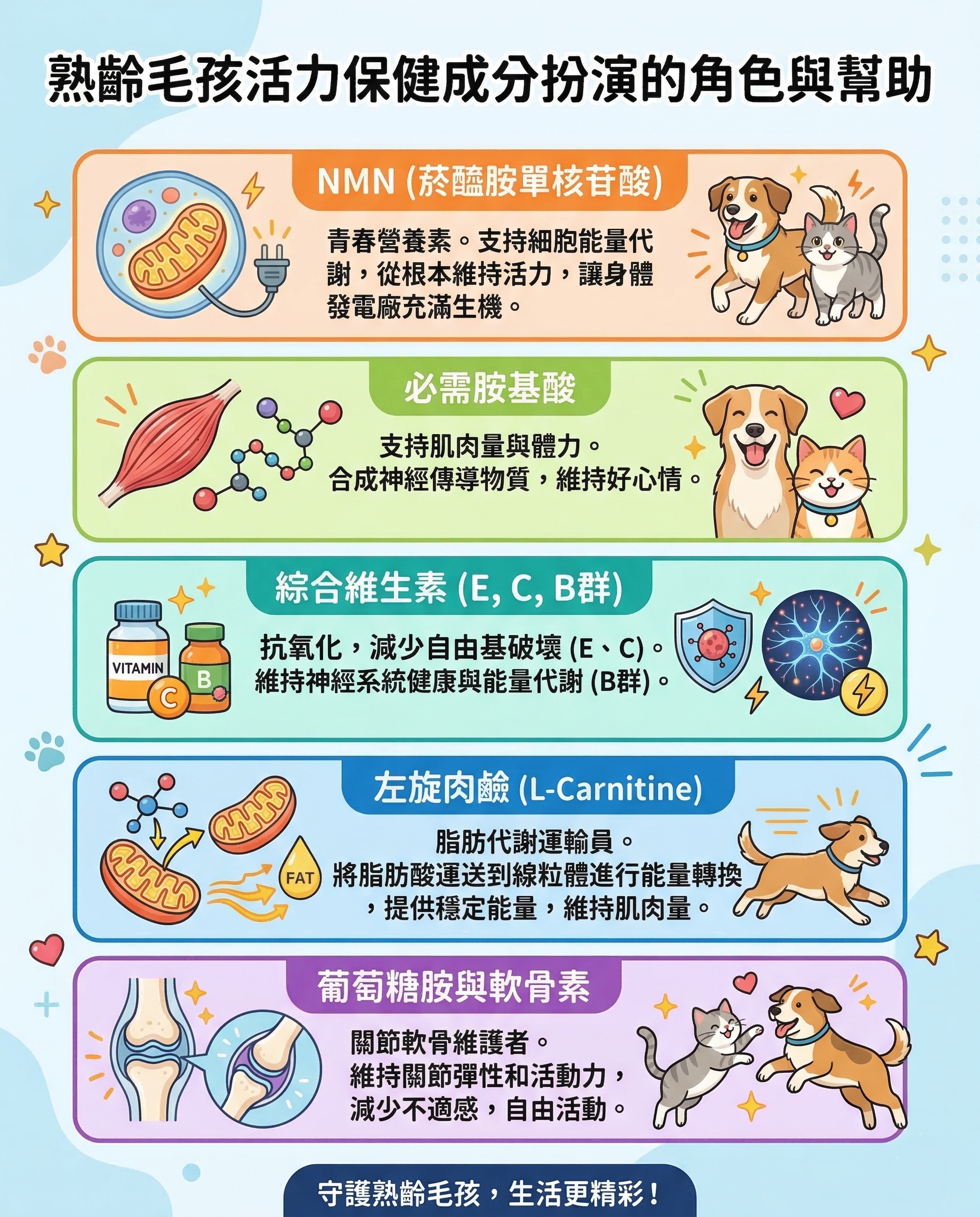 很多毛爸媽會問我:「我都有給他吃很好的熟齡飼料,這樣還不夠嗎?」事實上,隨著年紀增長,毛孩的腸胃吸收率會變差,且日常飲食往往難以提供足夠針對「大腦」與「細胞能量」的專屬營養。為了幫助維持活力,額外補充特定的營養素是非常關鍵的: