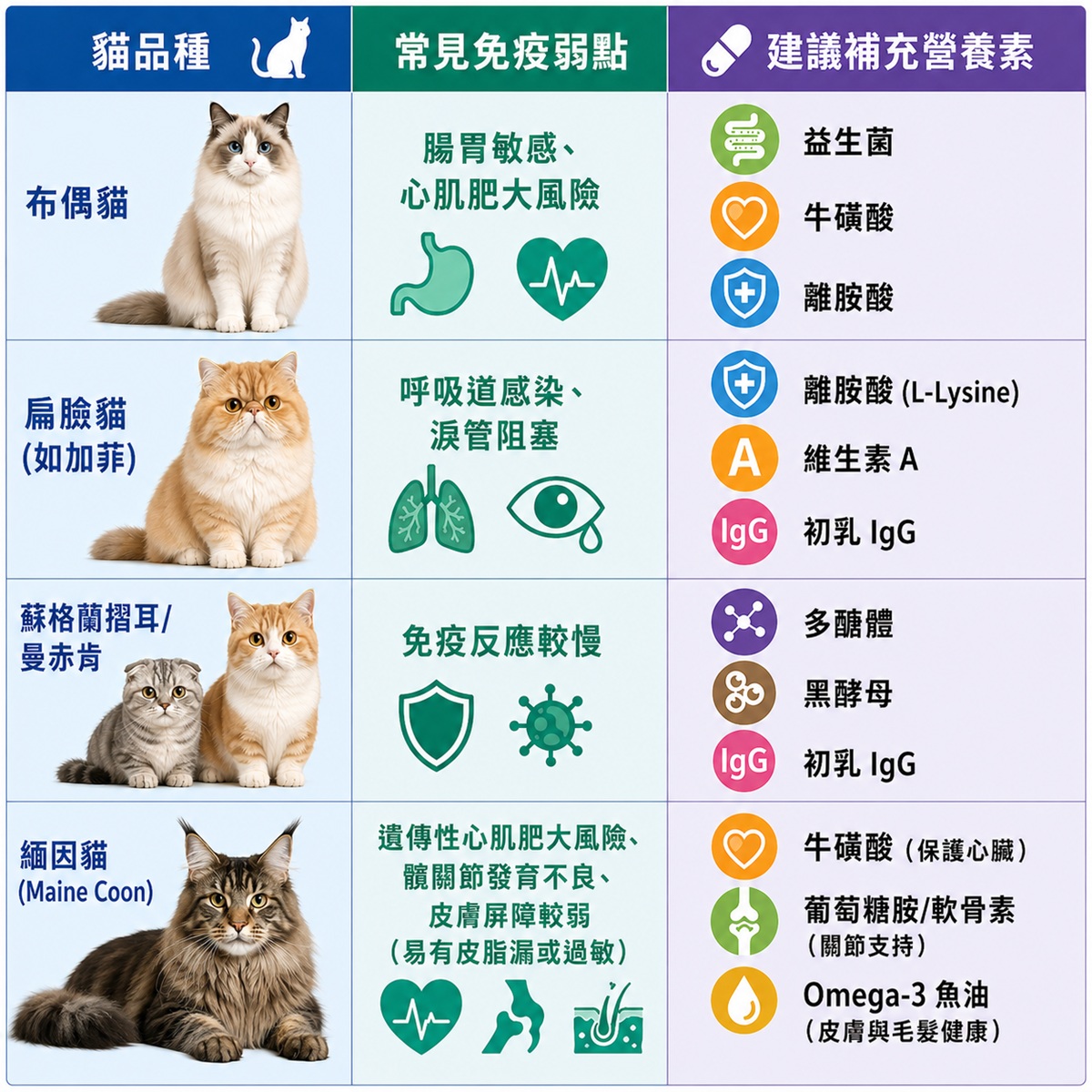 • 曼赤肯(短腿貓):骨骼結構特殊,身體修復能量有時會優先供應骨骼發育,導致免疫系統相對較弱。